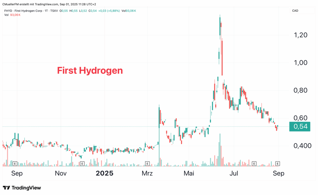 First Hydrogen aus Kanada setzt auf die innovative Kombination von SMR und „Pink Hydrogen“ – emissionsarmer Wasserstoff aus Kernkraft für abgelegene Regionen und Industrien ohne zuverlässiges Stromnetz. Der Fokus auf dezentrale, netzunabhängige Stromversorgung trifft genau Kanadas strukturelle Bedürfnisse und passt zudem in moderne ESG-Konzepte. Die Aktie schwankte zuletzt stark, konsolidierte nach einem Hype bis auf 1,30 CAD auf aktuell 0,60 bis 0,70 CAD. Durch Geschäftsverbindungen nach Europa und Wachstumsphantasie im Wasserstoffmarkt eröffnen sich zusätzliche strategische Möglichkeiten. Denn die politischen Rahmenbedingungen in Europa wie z.B. in Deutschland, Frankreich, Schweden, Polen und Tschechien begünstigen den Einstieg in diese innovativen Technologien.