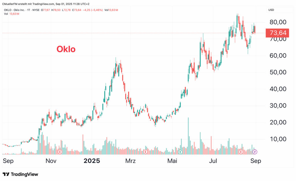Oklo, US-basiert und von Fantasie um die amerikanische Nuklear-Innovationspolitik getragen, zeigt mit der Aurora-Entwicklung und strategischen Partnerschaften wie mit Liberty Energy, echte Fortschritte in regulatorischer Genehmigung und kommerzieller Umsetzung. Die Aktie pendelte mehrfach zwischen 20 und 80 USD, bleibt aber hoch bewertet und lebt stark von der Hoffnung auf neue US-Programme und verkürzte Realisierungszeiten aus Washington. Der Zeitfaktor wird oft unterschätzt: Von Planung bis Netzanschluss vergehen auch bei Oklo mindestens 5 bis 8 Jahre, dann sind wir schon jenseits 2030.