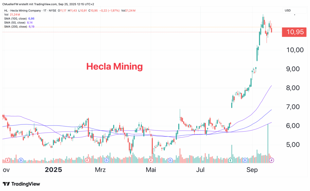 Hecla Mining (ISIN: US4227041062 | WKN: 854693) produziert vor allem in Nordamerika mit den drei Hauptminen Greens Creek (Alaska, USA), Lucky Friday (Idaho, USA) und Keno Hill (Yukon, Kanada). Der Schwerpunkt liegt klar auf der Förderung von Silber, welches im Portfolio die wichtigste Position einnimmt, begleitet von Gold als zweitem bedeutendem Metall. Insbesondere die Keno Hill-Mine hat sich als wichtiger Wachstumstreiber mit steigenden Silberreserven und Ertragskraft erwiesen. Zudem verfolgt Hecla konsequent Investitionen zur Verlängerung der Minenlaufzeiten und Effizienzsteigerung in diesen Betrieben.