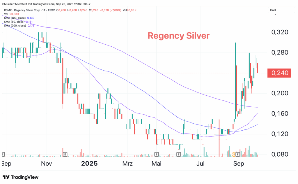 Ziel ist es, die bislang nachgewiesene hochgradige Mineralisierung entlang des Streichens weiter zu verfolgen und zu erweitern. Mit diesem Programm unternimmt Regency Silver einen weiteren Schritt, um das wirtschaftliche Potenzial von Dios Padre zu heben. Die Regency-Aktie (RSMX) hat sich von August bis Ende September glatt verdoppelt. Mit einer Marktkapitalisierung von 28 Mio. CAD ist aber noch viel Lust nach oben.