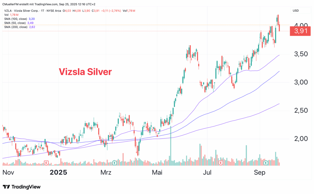 Ein neu entdeckter Mineralisierungs-Katalysator in der Animas-Zone erhöht die Aussicht auf zusätzliche Ressourcen. Insgesamt wird das Projekt durch die solide Finanzierung und das große Entwicklungspotenzial für Investoren immer attraktiver. Die Vizsla-Aktie (VZLA) erreichte mit 4,20 USD ein neues 52-Wochen-Hoch an der NYSE, nach 12 Monaten stehen 94,5 % Gewinn auf dem Kursbarometer. Die Rally dürfte mit steigenden Silberpreisen weitergehen.